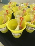 I had cellophane bags in my supply. I purchased these pail and shovel sets from the dollar store and included a Play-dough to go package, with some real fruit gummies.